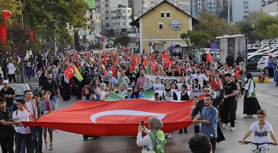Yürüyüş, Bandırma İDO önünden başlayarak Cumhuriyet Meydanı’na kadar devam etti. Ellerinde Türk ve Filistin bayrakları…